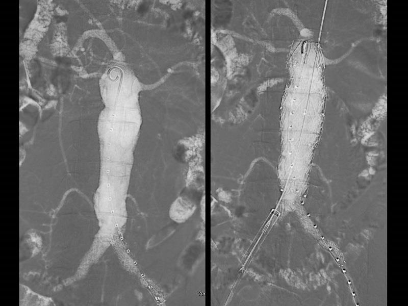 造影剤アレルギーがあったため、炭酸ガスを用いて腹部大動脈瘤のステントグラフト治療を行った。ハイブリッド手術室の透視装置では、炭酸ガスであってもこのような鮮明な画像が得られる。
