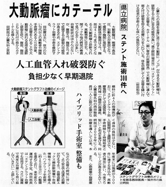 2009年よりステントグラフト治療に積極的に取り組んだ結果、手術総数が300例に到達し、2017年に福井新聞で紹介されるに至りました。2018年4月からは最新型の放射線透視装置を完備したハイブリッド手術室で手術を行うようになり、今まで以上に精度の高い治療を提供できるようになりました。当院は胸部ステントグラフト指導医が在籍する福井県唯一の施設であり、その債務は大きいと言えます。
