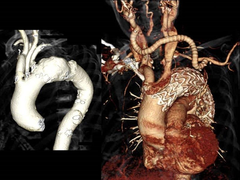 遠位弓部大動脈瘤に対してステントグラフト治療を行った。大動脈瘤が分枝の近くにあったため、あらかじめ右頚動脈から左頚動脈・左鎖骨下動脈にバイパスを作成し、ステントグラフトをより中枢に留置した。