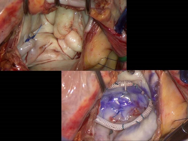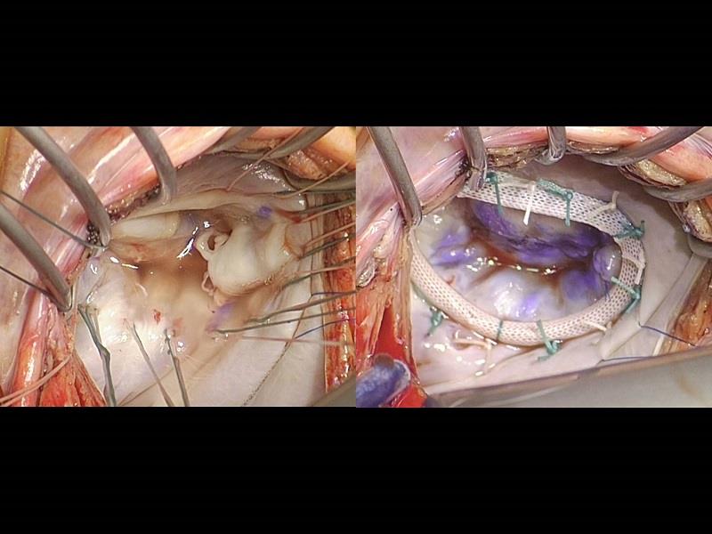 感染性心内膜炎による後尖の腱索断裂に対して形成術を行った。逸脱部は縫縮し、人工弁輪を装着した。