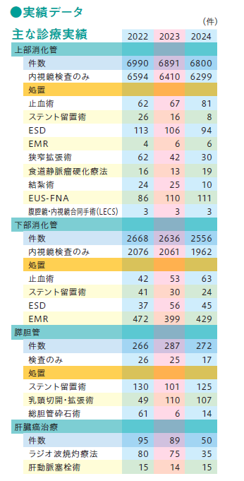 当院は日本消化器病学会の認定施設で、地域がん診療連携拠点病院にも指定されています.全ての消化器癌腫、全てのstageの症例の治療方針に関して外科、放射線科、腫瘍内科、陽子線を含む放射線治療科および病理医からなる癌診療チームで症例検討を行い、症例ごとに徹底的に多方面から集学的治療を検討しています。令和6年度の内視鏡検査治療件数は9,600件を超え県内トップクラスの検査治療を行っております。食道、胃、大腸の腫瘍診断は全例に拡大内視鏡や色素内視鏡を用いた早期消化管がんの確実な診断を行い、一括切除による確実な治療を目指しています。内視鏡治療や手術の適応がない症例でも、生活の質や栄養管理に注意しながら、化学療法や化学放射線療法で予後改善を目指しています。