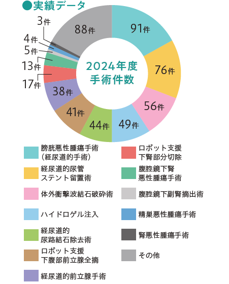 症例数の多い尿路結石症に対しては、体外衝撃波結石破砕術、経皮的あるいは経尿道的内視鏡レーザー手術を積極的に行っています。他の医療機関から緊急例での紹介が多い、敗血症あるいはDICを合併した重症閉塞性腎盂腎炎に対しては、緊急外来において経尿道的尿管ステント留置や腎瘻造設などの迅速な尿路ドレナージを実施した後に、内科および救命救急センターとの密接な連携のもと集中治療室(ICU)での全身管理を行っています。