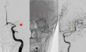 ★ 左中大脳動脈が血栓により閉塞 →血栓回収用のカテーテルを挿入 →吸引後再開通を得る |