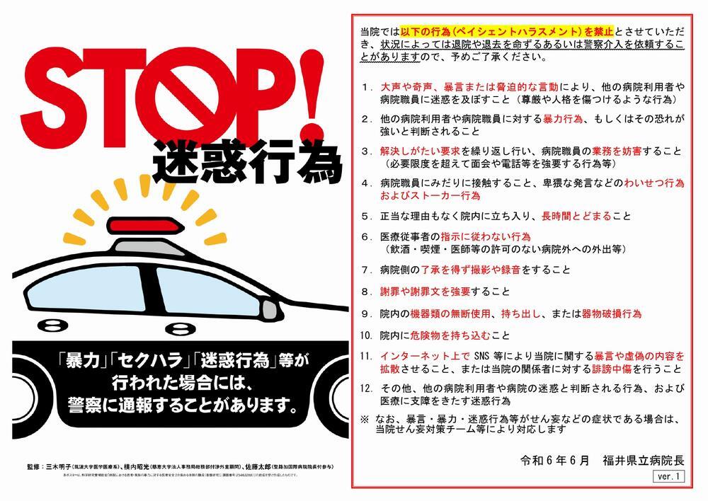 医療スタッフが集中して質の高い医療を提供し、患者さんが安心して治療に専念できる環境を確保するため、これらを害する暴言・暴力・迷惑行為等(ペイシェントハラスメント)に対しては組織的に対応いたします。また、状況によっては退院や退去を命ずるあるいは警察介入を依頼することがありますので、予めご了承ください。