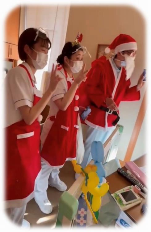 サンタクロースとトナカイにふんした医師と看護師が、病室で子どもたちにメッセージカードとお菓子のプレゼントを配りました。大好きな先生サンタを見た子供たちは、驚いたり喜んだり、病棟はとても温かい雰囲気に包まれました。
