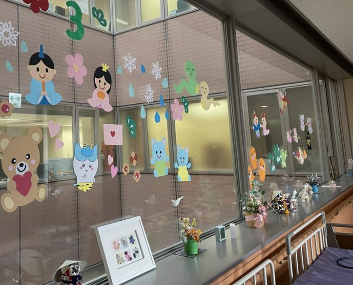 患者さんやそのご家族さんが少しでも笑顔に入院生活を過ごせるよう新人看護師が積極的に病棟の窓にイラストを作って貼っています。