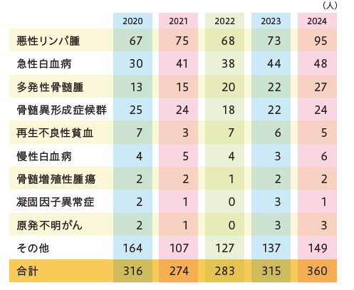 白血病、悪性リンパ腫、多発性骨髄腫、骨髄異形成症候群、再生不良性貧血、悪性貧血、溶血性貧血、特発性血小板減少性紫斑病、原発不明がん