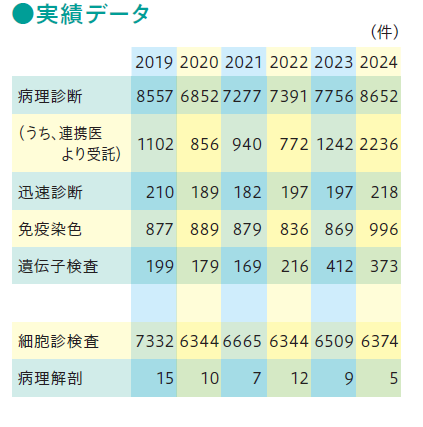 - 剖検(病理解剖):不幸にして病気で亡くなられた患者さんのご遺体を、家族の了承を得て解剖します。生前の診断や治療の評価や今後の医療の進歩に貢献します。