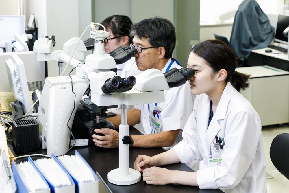 病理診断・細胞診断は、患者さんの病気の診断において、特にがんの診断では、最終的な診断となる重要な検査です。診断(検査)にあたっては、間違いのないよう細心の注意を払い、最新の知識をもって対応しています。 病理診断科の医師およびスタッフは、患者さんに直接お会いして、診察を行ったり、お話をしたりすることはほとんどありませんが、患者さんや院内の医療者の手助けを行っています。