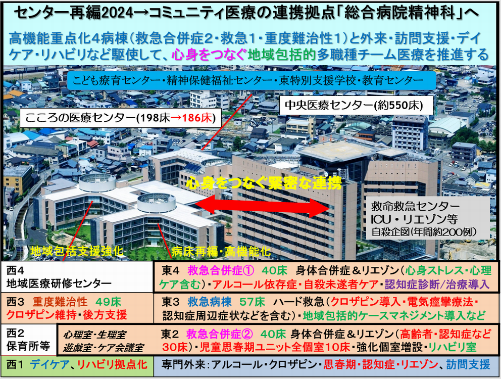 今や精神疾患は癌などと並ぶ5大疾病に指定され、厚労省も精神病床の機能分化、早期退院・社会復帰や地域との連携強化などを求めています。近年、救命救急センター患者の約10%は精神科関連といわれ、身体と精神の傷病を併せ持つ緊急・重症な身体合併症の患者さんも増加しています。当こころの医療センターのような救命救急センター併設の有床総合病院精神科は全国的にもほとんどなく、その重要性は高まっています。