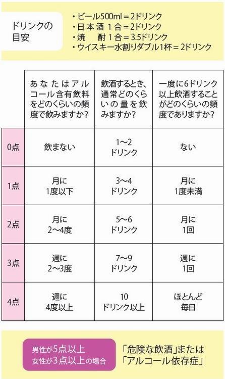 AUDITアルコール使用障害同定テスト(簡易版) WHOが作成したスクリーニングテストでの最初の3項目で男性は合計5点以上、女性は3点以上で「危険な飲酒」または「アルコール依存症の疑い」と評価します
