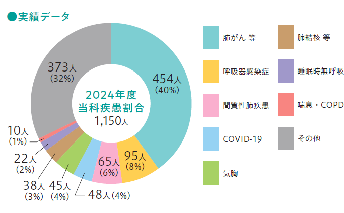 肺がん・その他肺悪性腫瘍、呼吸器感染症(肺炎、肺化膿症、膿胸など)、抗酸菌症(肺結核、肺非結核性抗酸菌症など)、間質性肺疾患、気管支喘息、COPD、急性・慢性呼吸不全、気胸・胸水貯留・胸膜疾患、睡眠時無呼吸症候群、気管支出血、遷延性・慢性咳嗽