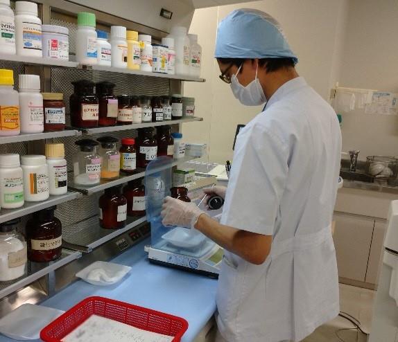 院内製剤とは、患者さんの病状・疾患の種類や程度・製品の規格が治療上適切でない等の理由により、市販されている製品では治療困難な場合に、院内で調製する製剤です。特定の患者さんや疾患の治療に必要な製剤で、個々の患者さんのニーズに対応し薬物治療の向上に役立っています。