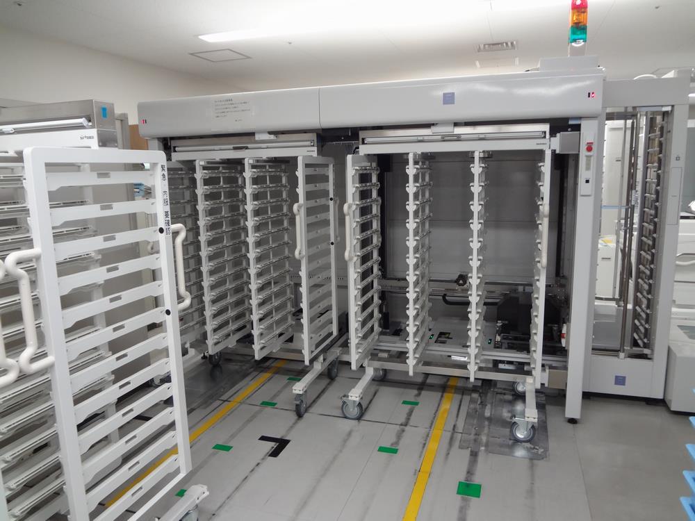 主に入院患者さんの注射薬を払い出しています。医師が電子カルテで入力した情報が薬剤部内の注射システムに送られてきます。調剤室の処方システムと同様に、用法・用量や相互作用等に問題がないかのチェックを行い、個人別注射薬自動払い出し機(患者毎の注射薬が自動的にトレーの中に払い出される機械)を使って注射薬を払い出し、最終監査を行います。この機械を使用することにより、安全性と効率性が向上しています。