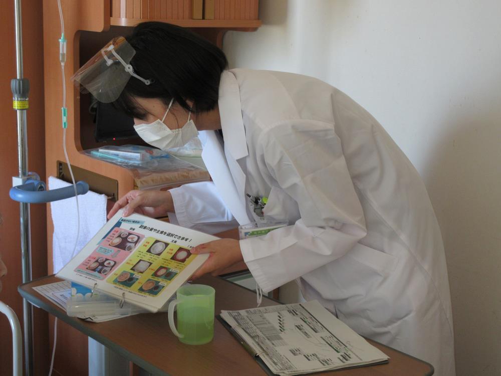 - 食事摂取量が低下している患者さんには病室に訪問し、病態や嗜好に合わせた食事内容の検討や栄養補助食品の提案などを行っています