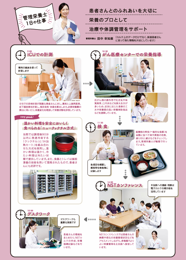 管理栄養士は、チームの一員として患者さんの年齢や体格・病気の状態に基づいた必要栄養量の算出と適切な栄養投与方法の検討、必要栄養量を確保できるような食事などの提案を行っています。