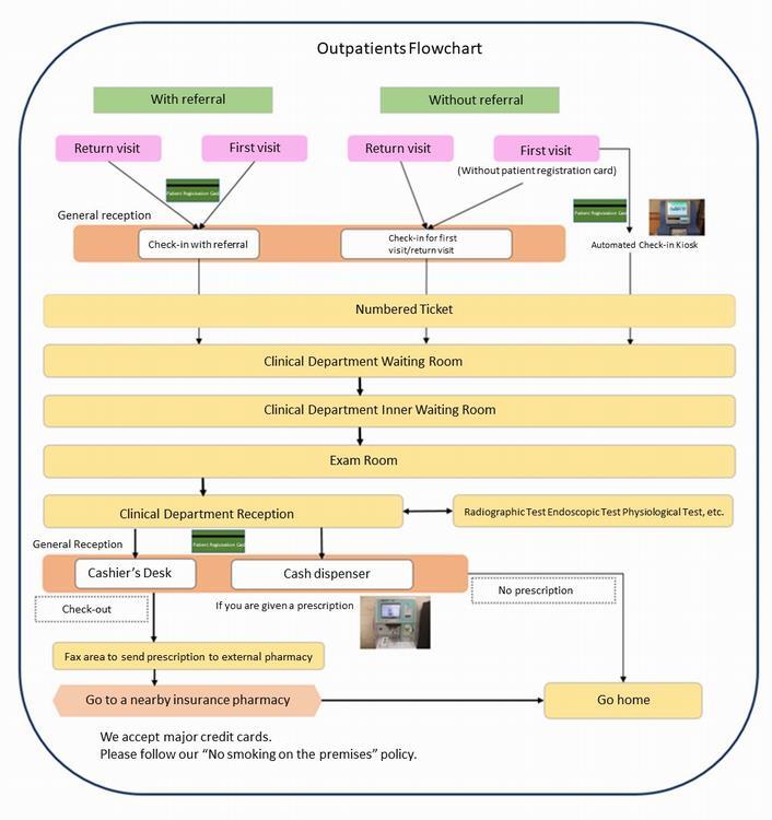 - A Numbered Ticket will be issued which includes a reception number and the day’s schedule such as your appointment time for your exam. Please bring the Numbered Ticket immediately to the reception desk for outpatients.