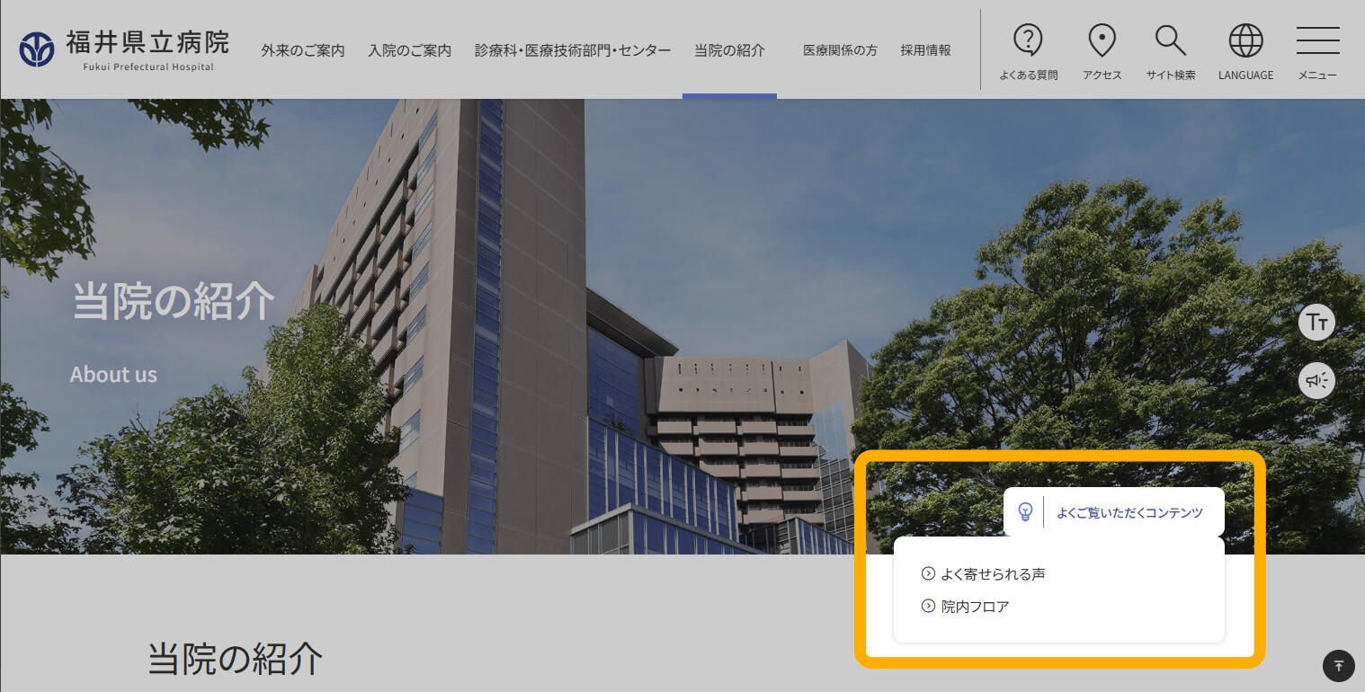 メインメニューにある、各大カテゴリ(例:「外来のご案内」「入院のご案内」など)ごとに、人気ページを表示します。